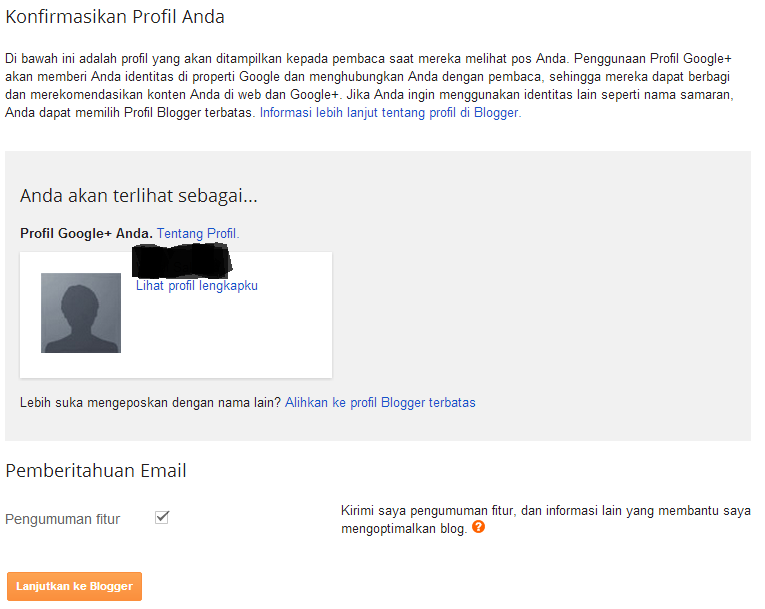 4. setelah masuk, akan dimintai informasi profil yang akan digunakan. klik "Lanjutkan Ke Blogger".